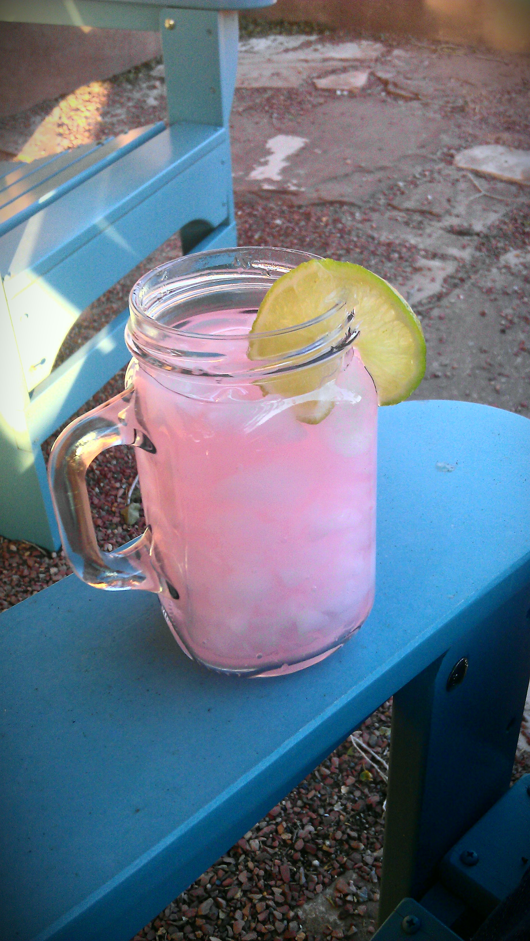 So I came up with this when I was bored with the “normal” margarita recipes. I had tried Dekuper Peach Schnapps in a drink called “Silk Panties” (vodka + Dekuper Peach Schnapps on the rocks) and I loved how Dekuper had nailed the natural taste of peaches. So I substituted the usual triple sec (orange liquor) with the peach schnapps and VIOLA! It was heavenly. I can’t stress how important it is to use Dekuper Peach Schanpps (No I don’t own stock in the company!) It’s the fresh peach taste that makes this such a light flowery taste. The Grenadine is of course the PINK!
