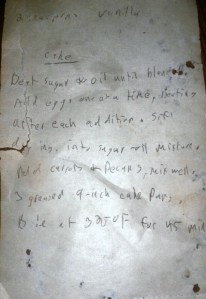 The other day, my mom was cleaning out some things and in this shoebox with a bunch of random stuff was the recipe. I don’t know how it got in the box or where it has been. It has holes and water stains on it, so I don’t know if it was downstairs and somehow survived and got put in the box. Or if it was upstairs in the box all along, but I don’t know how it could have been upstairs. It’s just a mystery. But now after all this time we have Jimmy’s mom’s carrot cake recipe. It is my favorite.